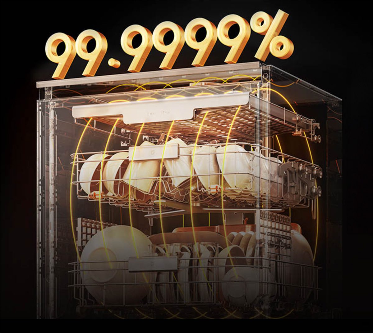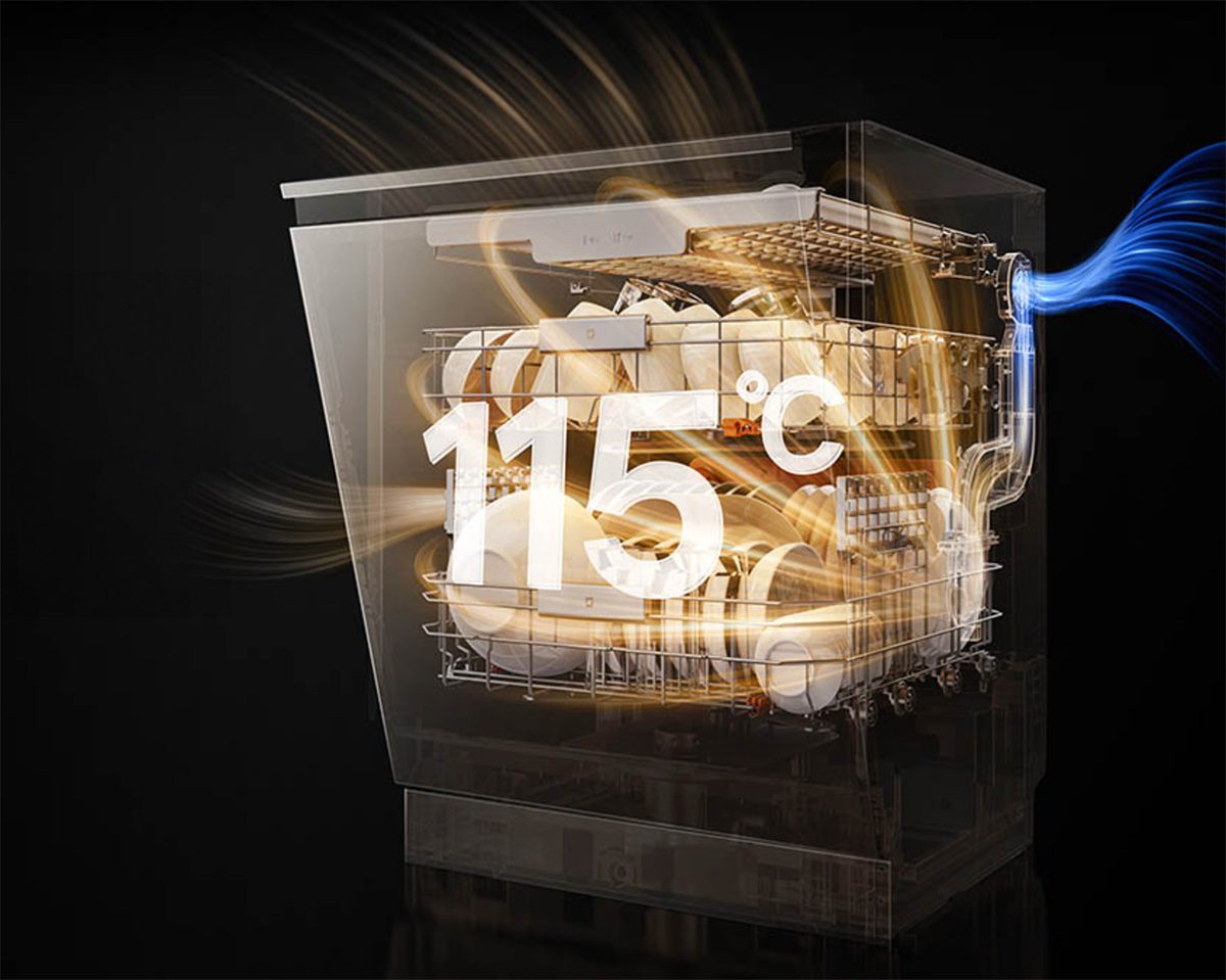 Cánh tay phun rửa được thiết kế để loại bỏ mọi vết bẩn ở mọi góc độ của bát đĩa. Máy có thể chứa đến 16 bộ bát đĩa trong một lần rửa và tích hợp chương trình sấy khô ở nhiệt độ 115°C, cùng với công nghệ khử mùi ion, đảm bảo bát đũa của bạn luôn sạch sẽ và an toàn với tỷ lệ diệt khuẩn lên đến 99,9999%.