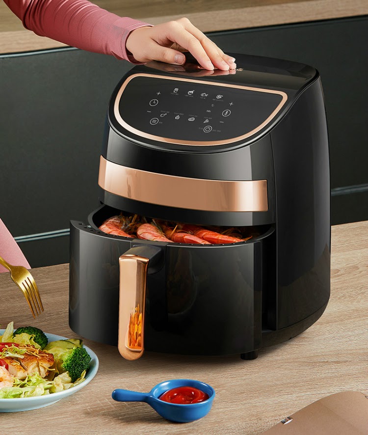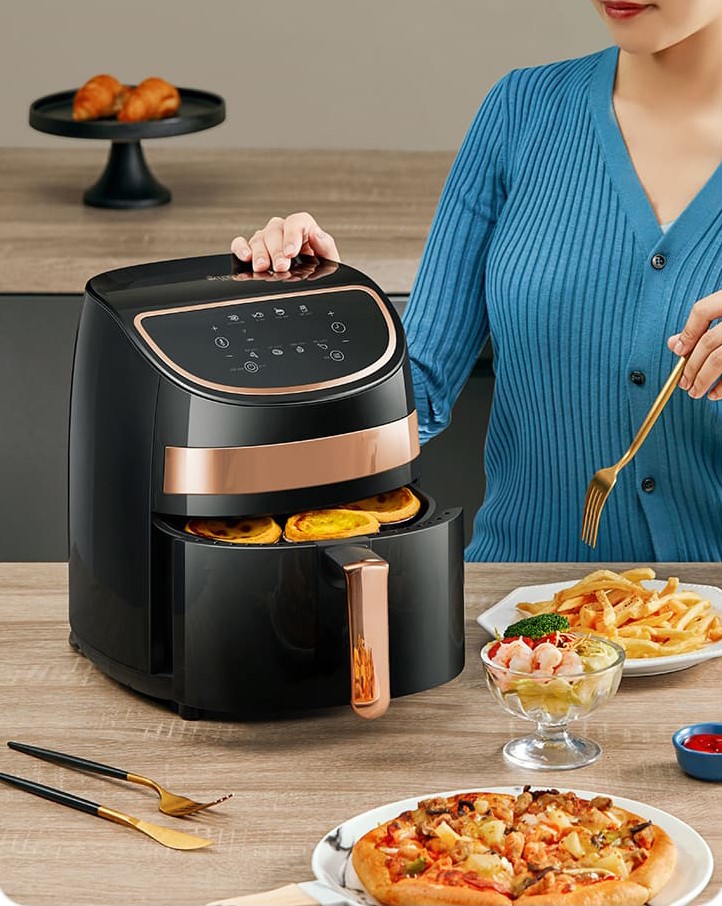 Bảng điều khiển cảm ứng thông minh được tích hợp vừa tăng tính thẩm mỹ, sang trọng cho nồi chiên không dầu, vừa hỗ trợ các thao tác điều khiển của người dùng được thực hiện một cách dễ dàng và trực quan hơn. Cụ thể, 8 “chương trình” nấu ăn được cài đặt sẵn trên bảng điều khiển giúp người dùng thuận tiện lựa chọn chế độ phù hợp nhất để chế biến nhiều loại thực phẩm khác nhau như gà, beefsteak, cá, tôm, khoai tây, pizza,…cùng các món tráng miệng khác.