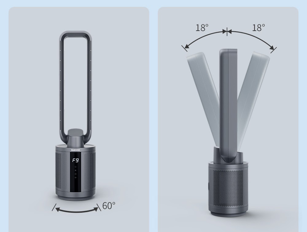 Mặc dù là một chiếc quạt với kết cấu không cánh tuy nhiên DAEWOO F9 MAX 2021 vẫn đảm bảo được khả năng cung cấp không khí ở diện tích bao phủ rộng. Cụ thể quạt có khả năng xoay trái phải 60 °, lên xuống 18 ° làm mát ở mọi diện tích ngay cả ở các góc không được thổi trực tiếp. Đặc biệt khi quạt kết hợp với máy điều hòa sẽ cho khả năng làm mát toàn bộ không gian, lưu thông không khí mát mẻ đều hơn, giữ nhiệt độ căn phòng ở mức vừa phải.