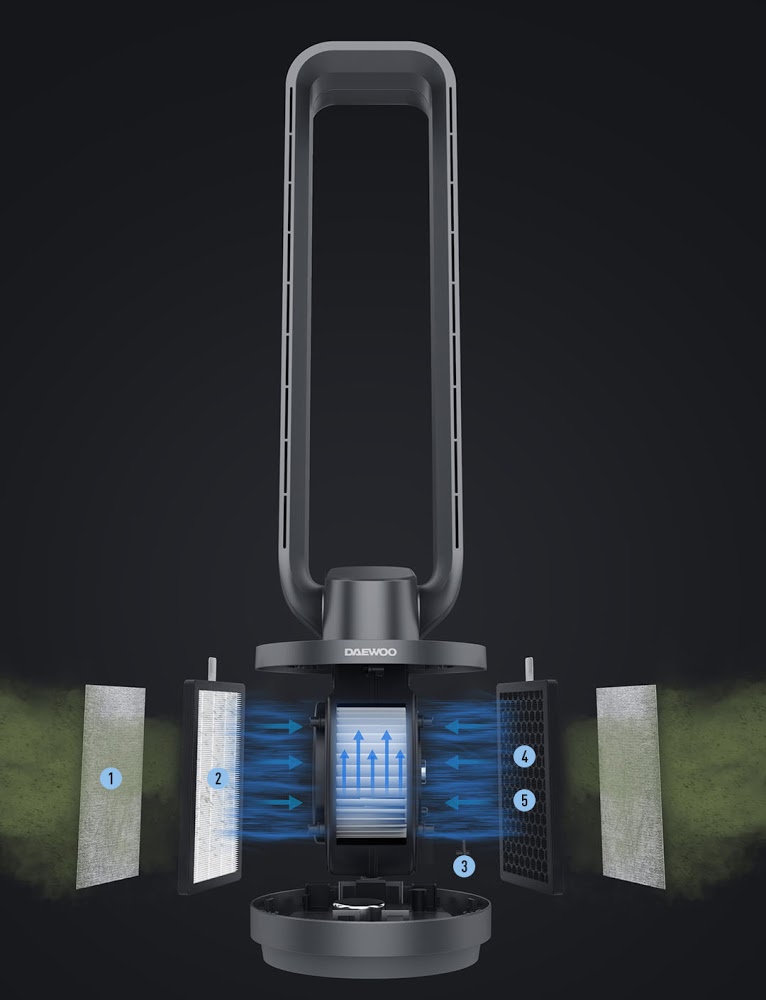 Quạt không cánh DAEWOO F9 MAX 2021 được đặc biệt tích hợp hệ thống 5 lớp lọc là lớp kháng khuẩn ion bạc, bộ lọc HEPA, bộ lọc ion, tinh thể nano và cuối cùng là lớp lọc vỏ dừa hoạt tính. Cụ thể lớp khử trùng ion bạc có thể hấp thụ và tiêu diệt các vi khuẩn, bộ lọc ion giúp giải phóng các ion oxy âm làm cho các tạp chất lơ lửng trong không khí lắng xuống mang lại bầu không khí trong lành hơn.