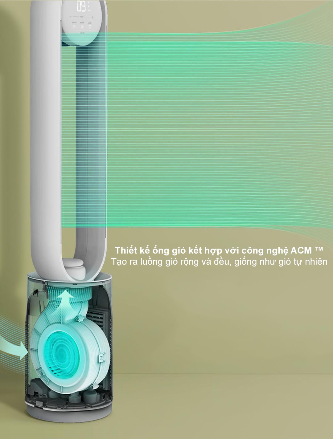 hiết kế ống gió độc đáo kết hợp với công nghệ ACM ™ (Air Centification & Multiplication) được cấp bằng sáng chế, giúp tạo ra luồng gió rộng, mềm mại, gần với gió tự nhiên. Hỗ trợ cung cấp đến 750L không khí mỗi giây, nhanh chóng xua tan cái nóng oi bức của ngày hè. Mang đến cho người dùng cảm giác dễ chịu, hạn chế các triệu chứng khó chịu như mệt mỏi hay nhức đầu dù sử dụng quạt KEHEAL trong thời gian dài.