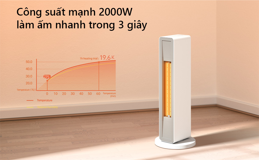 Quạt sưởi được trang bị công suất lên đến 2000W, bạn sẽ không cần phải đợi máy khởi động làm nóng như những máy sưởi thông thường khác, mà chỉ cần mất 3s đã đủ để bạn cảm nhận được hơi ấm từ máy toả ra.