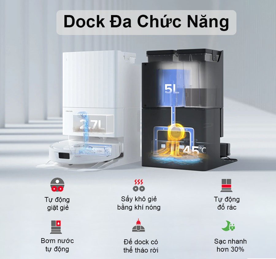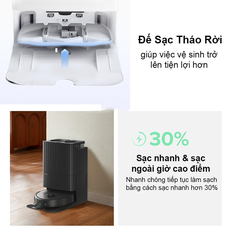 - Hệ thống Dock sạc toàn năng: tự động xả rác, tự động rửa & sấy khô khăn lau, tự động bổ sung nước sạch, đế sạc có thể xả rác, sạc nhanh hơn 30%