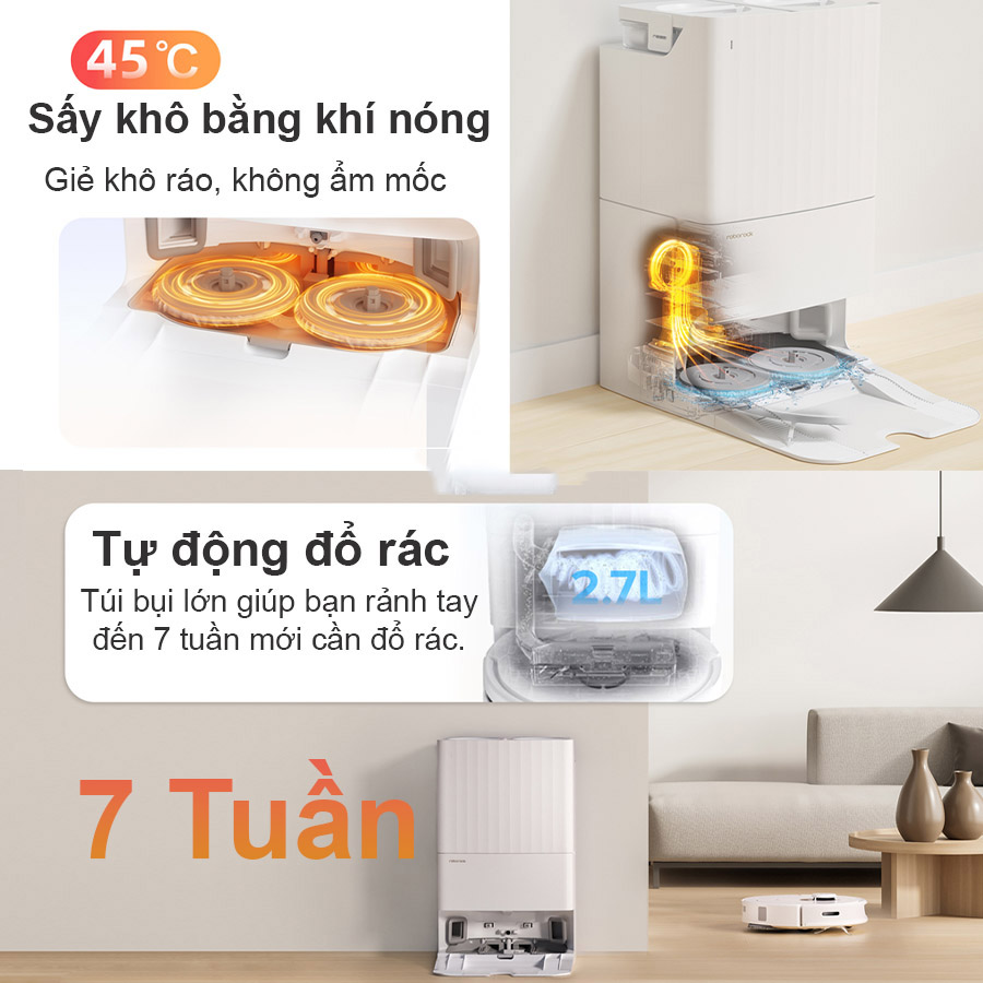 Đầu tiên là tính năng tự động đổ rác, giúp giải phóng người dùng khỏi sự phiền toái của việc phải thường xuyên đổ rác. Tiếp đến là tính năng tự động giặt và sấy khô giẻ lau bằng khí nóng, đảm bảo phần giẻ lau luôn sạch sẽ và sẵn sàng cho lần làm việc tiếp theo.