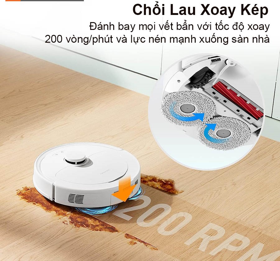 Với khả năng lau xoay kép 360 độ cùng tốc độ xoay ấn tượng lên đến 200 vòng/phút, Roborock Q Revo đảm bảo mọi vết bẩn trên sàn nhà sẽ bị loại bỏ một cách nhanh chóng. Bên cạnh đó, công nghệ lau xoay kép trên Q Revo cũng tạo một lực nén lớn xuống sàn nhà, giúp cho phần giẻ lau tiếp xúc sâu hơn với bề mặt, mang lại khả năng lau sạch vượt trội.