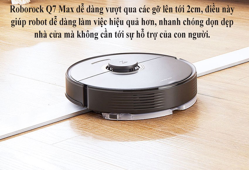 Chức năng vượt chướng ngại vật Roborock Q7 Max cực kì hiệu quả, leo dốc có độ nghiêng 25o, gờ, thảm sàn cao nhỏ hơn 2cm, tương thích và phù hợp tất cả các vật liệu nền nhà khác nhau.
