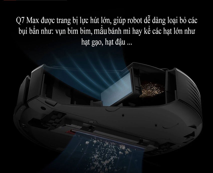 Ngoài ra, chổi chính được thiết kế liên mạch để chống rối tóc hiệu quả, nâng cao khả năng làm việc cho robot. Không chỉ thế chổi chính còn thiết kế gần sát sàn nhà hay sát trên thảm giúp Q7 Max có thể quét sạch bụi bẩn, bụi mịn có trên thảm một cách tốt nhất.