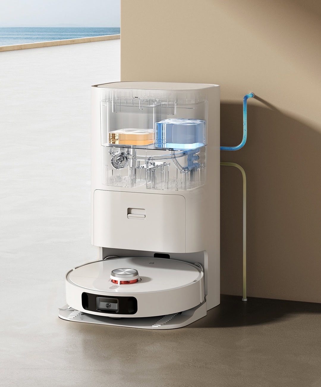 Bên cạnh chức năng hoạt động như một trạm sạc cho robot, thì phần dock đi kèm với robot còn hỗ trợ chức ănng tự động dọn dẹp bụi, giặt, sấy nóng và khử trùng khăn lau cho máy hút bụi. Người dùng cũng không cần phải thực hiện thủ công các thao tác thay nước hay đổ nước. Sau khi hoàn thành thao tác giặt sấy khăn lau, máy sẽ tự động đổ đầy nước vào thùng chứa nước thải. Ngoài ra máy cũng được thiết kế chống tắc nghẽn hiệu quả tránh việc hút bụi sẽ làm tắc nghẽn đường ống thải gây ảnh hưởng đến quá trình vận hành máy.