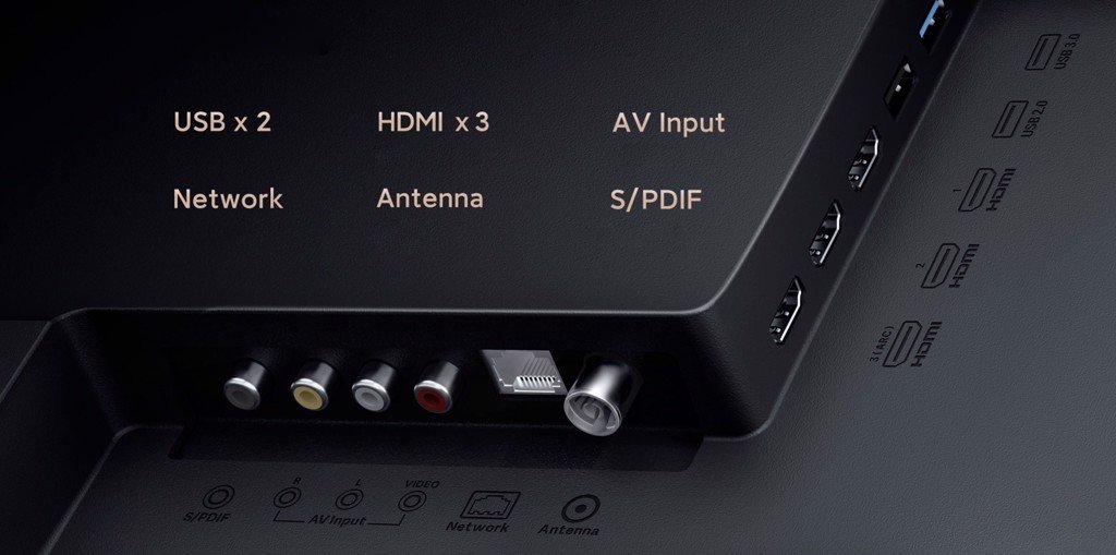 Tivi Xiaomi ES65 2022 được trang bị 3 cổng HDMI, 2 Cổng USB, Network, AV Input, Antenna, S/PDIF dễ dàng kế nối với máy tính, bảng điều khiển trò chơi và thiết bị âm thanh bên ngoài.