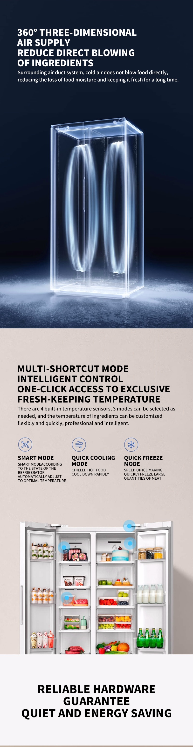 Phần còn lại, Mijia Fridge 610L Ice Crysta được tích hợp 4 cảm biến nhiệt độ và cung cấp 3 chế độ: chế độ thông minh, chế độ làm lạnh nhanh và chế độ làm đông nhanh. Người dùng có thể lựa chọn theo nhu cầu và tùy chỉnh nhiệt độ của nguyên liệu một cách linh hoạt và nhanh chóng