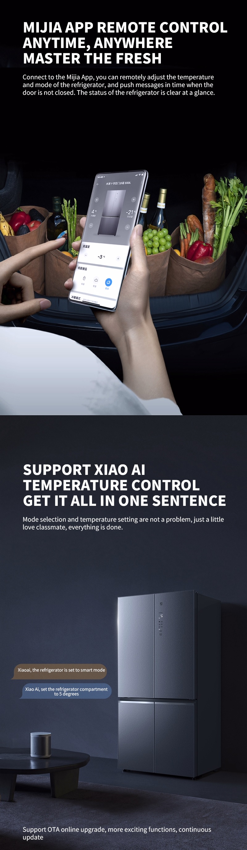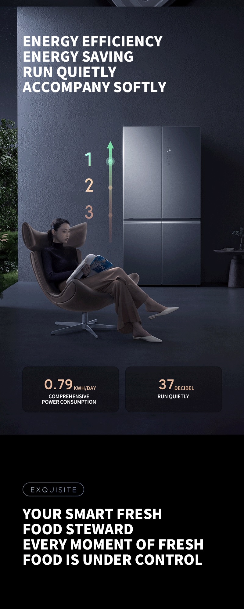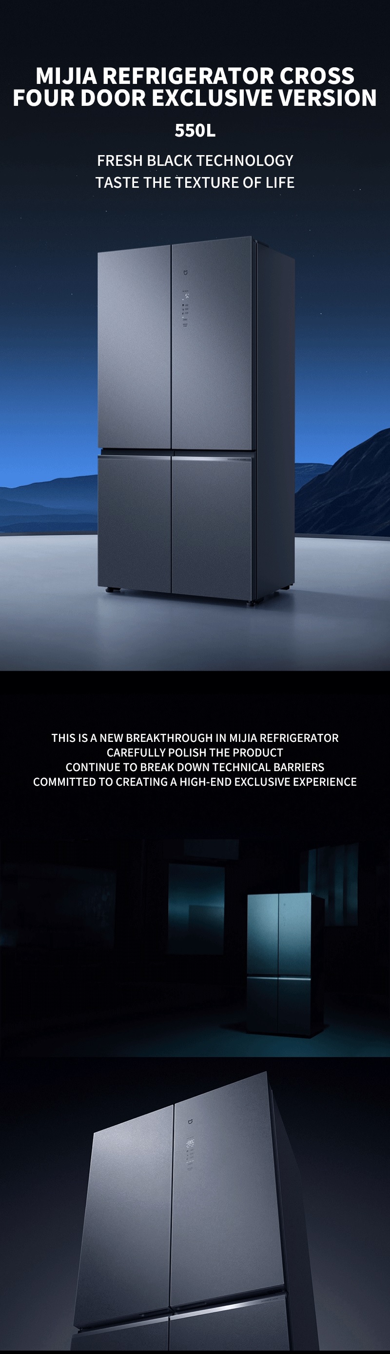 Mijia Fridge Four Door Exclusive Edition 550L có điểm mạnh là khử trùng tích cực với 120 triệu nhóm ion âm và dương năng lượng cao, nó đi kèm với bề mặt tinh thể băng nhám và nghệ thuật và 7 phân vùng độc lập để lưu trữ.