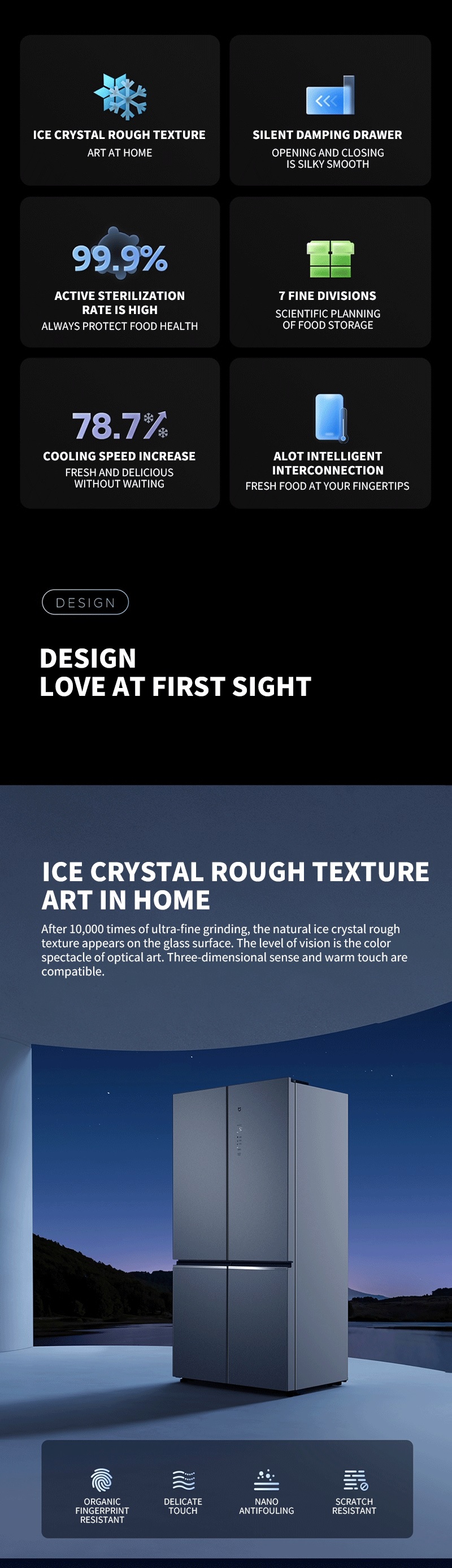 Về hình thức, tủ lạnh Mijia Cross Four Door Exclusive Edition đã được đánh bóng siêu mịn, thể hiện kết cấu tự nhiên của tinh thể băng nhám trên bề mặt thủy tinh, cho hiệu ứng ba chiều và mềm mại khi chạm vào.