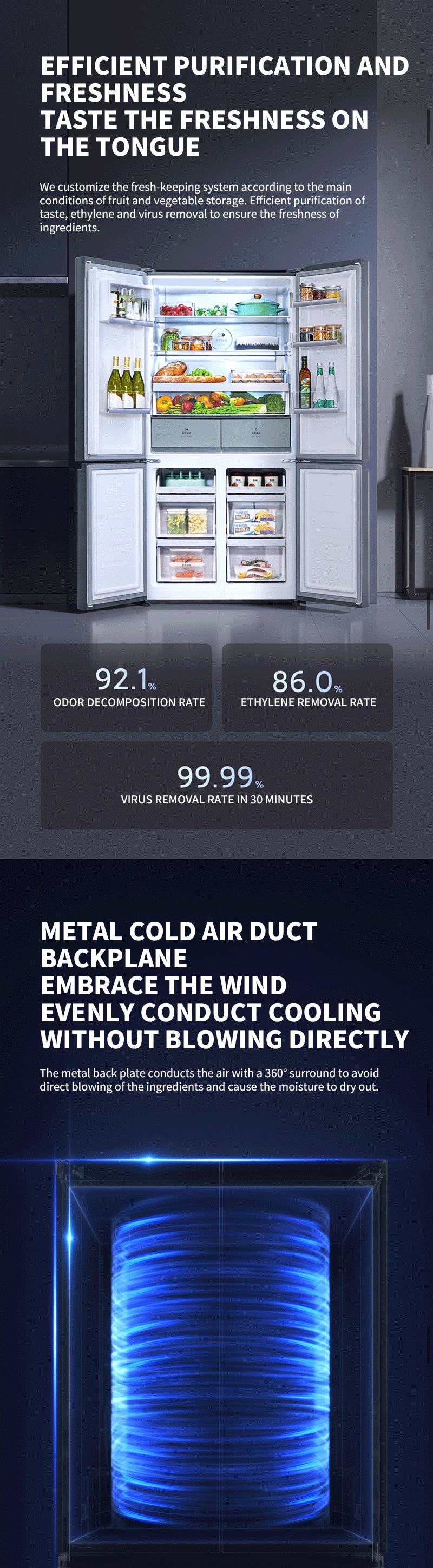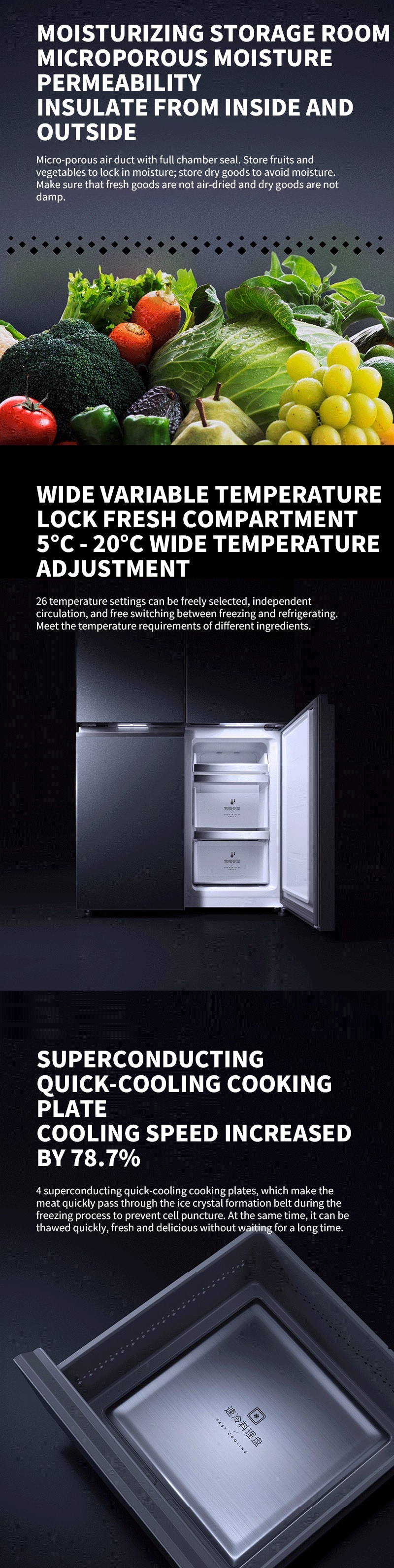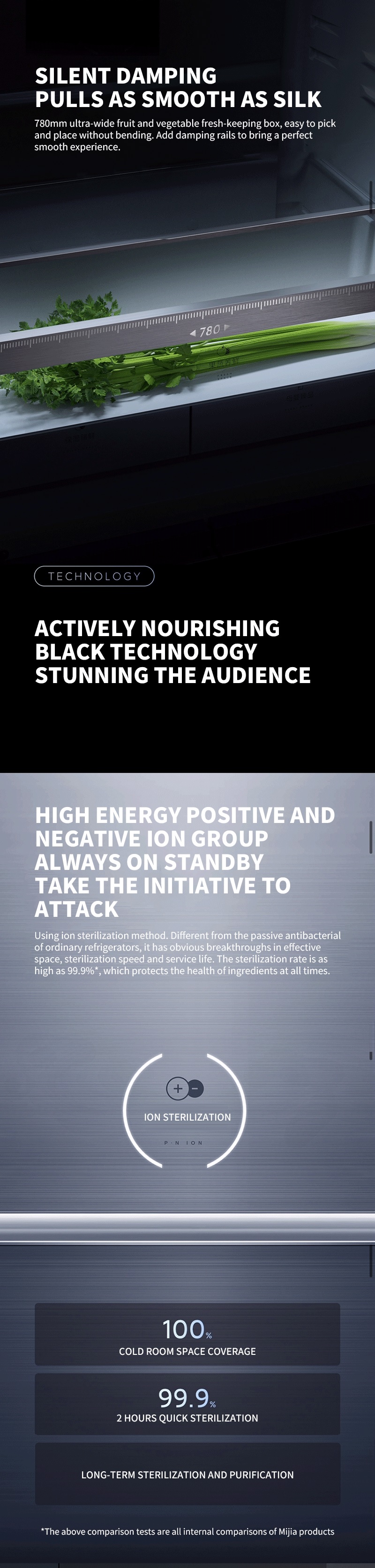 Điều đáng nói là Tủ lạnh Mijia Cross Four Door Exclusive Edition áp dụng phương pháp khử trùng bằng ion và tỷ lệ khử trùng đạt 99,9%. Đồng thời, đối với điều kiện bảo quản rau quả là chính, hệ thống bảo quản tươi sống được cung cấp để làm sạch toàn bộ, loại bỏ etylen và loại bỏ virus với hiệu quả cao và thanh lọc để đảm bảo thực phẩm luôn tươi ngon như trước.
