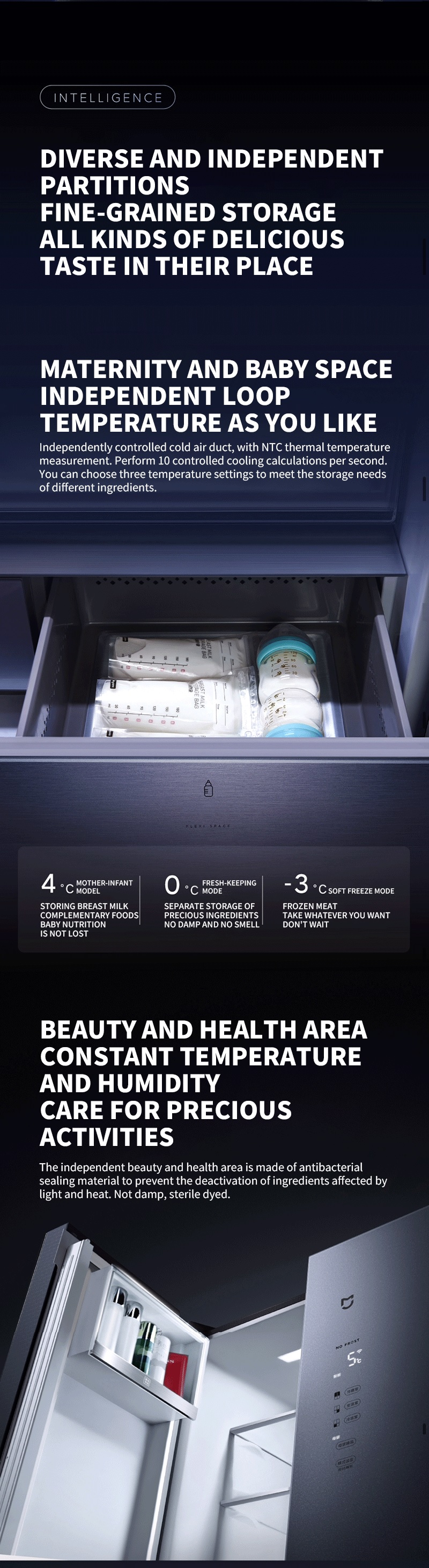 Mijia Fridge Four Door Exclusive Edition cho khả năng khử trùng bằng ion hoạt tính với hiệu suất lên đến 99.9%, giúp thực phẩm được tươi và giữ được lâu hơn. Ngoài ra, tủ lạnh còn có thể loại bỏ ethylene hoặc mùi hôi quá mức từ thực phẩm, tất cả được thực hiện chỉ trong 30 phút. Đặc biệt, chiếc tủ lạnh còn được trang bị 1 ngăn dành cho mẹ bỉm sữa với khả năng làm lạnh riêng, độc lập.