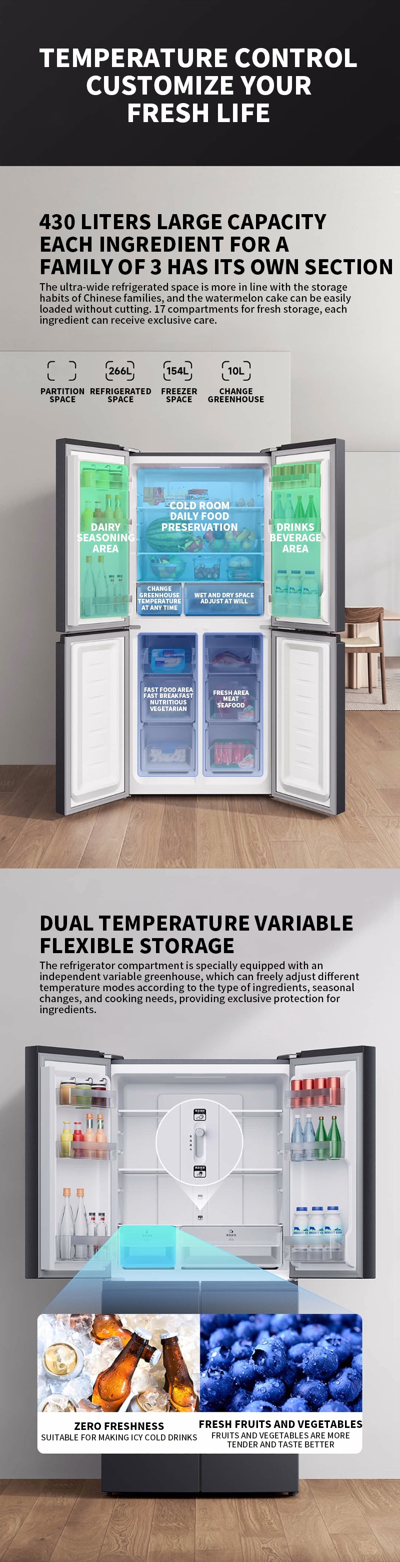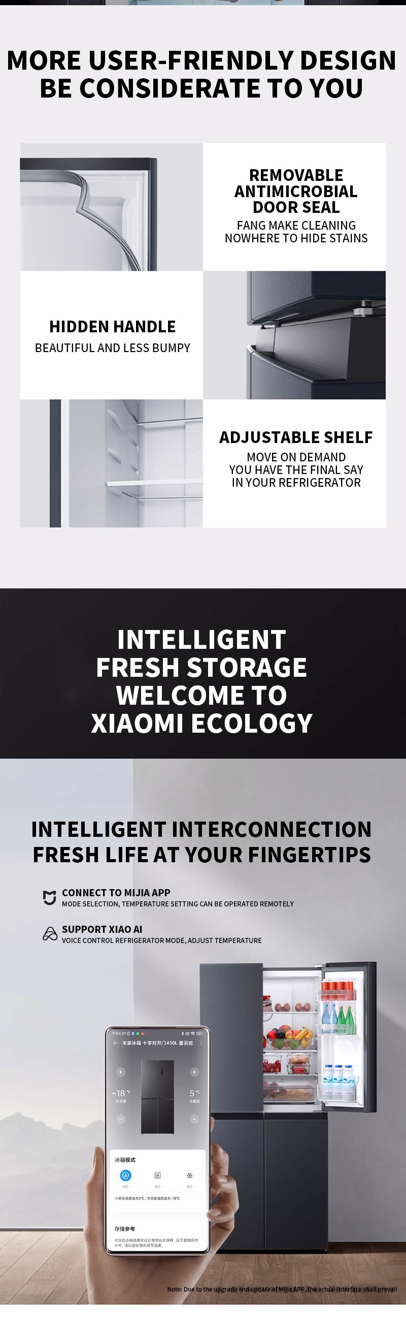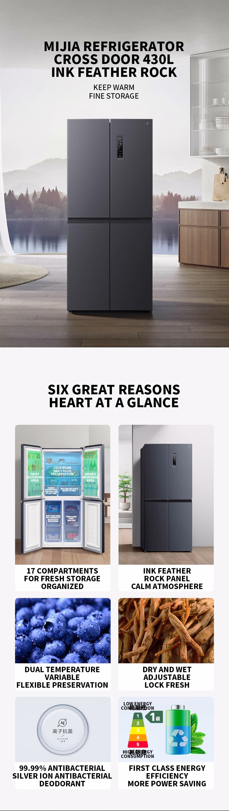 Xiaomi MIJIA Cross Door Refrigerator 430L có khả năng điều chỉnh chế độ nhiệt độ tùy theo loại thực phẩm, sự thay đổi theo mùa và nhu cầu nấu nướng. Mô-đun kháng khuẩn và khử mùi ion bạc giúp hấp thụ và phân hủy các mùi hôi trong tủ lạnh. Hiệu quả của bộ kháng khuẩn là 99.99% trong khi khả năng khử mùi cũng đạt được ít nhất 91%.