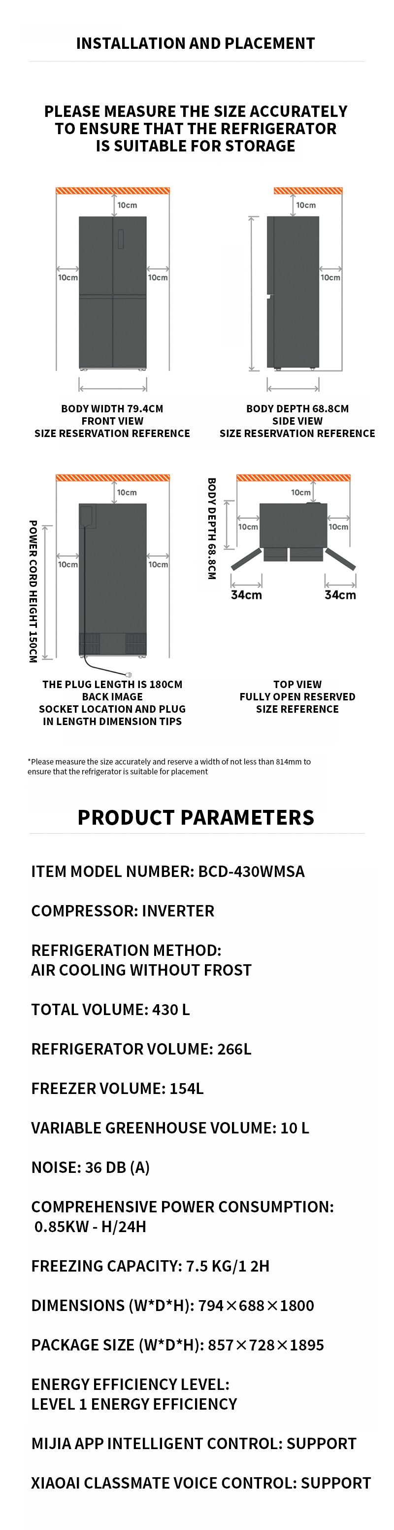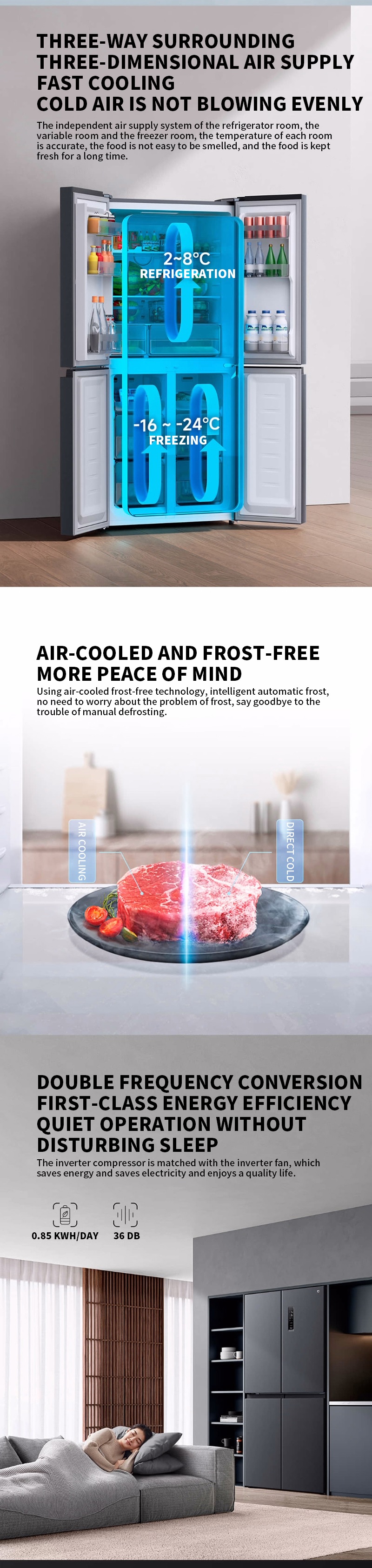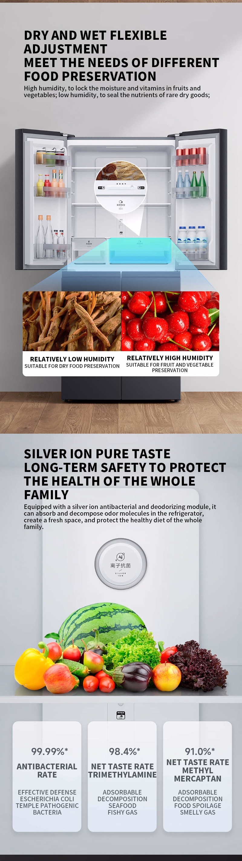 Xiaomi MIJIA Cross Door Refrigerator 430L có khả năng điều chỉnh chế độ nhiệt độ tùy theo loại thực phẩm, sự thay đổi theo mùa và nhu cầu nấu nướng. Mô-đun kháng khuẩn và khử mùi ion bạc giúp hấp thụ và phân hủy các mùi hôi trong tủ lạnh. Hiệu quả của bộ kháng khuẩn là 99.99% trong khi khả năng khử mùi cũng đạt được ít nhất 91%.