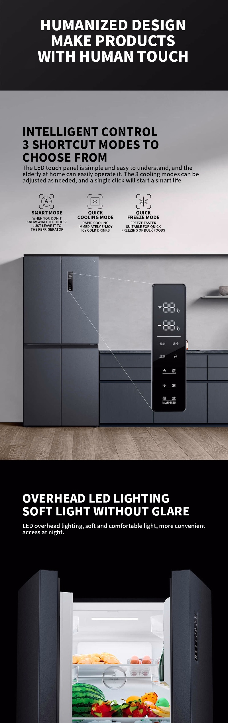 Cửa tủ lạnh được trang bị màn cảm ứng LED với các nút điều khiển đơn giản. Ba chế độ làm mát có sẵn và điều này có thể được điều chỉnh thông qua bảng điều khiển cảm ứng. Tủ lạnh có đèn LED chiếu sáng phía trên. Nó cũng có thể được điều khiển thông qua ứng dụng MIJIA và trợ lý giọng nói XiaoAI.