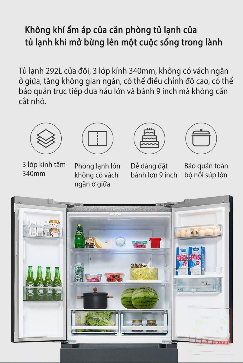 Tủ lạnh kiểu Pháp 445L được sử dụng công nghệ làm mát không khí, làm lạnh và đông lạnh mà không có sương giá. Làm nguội đều cà giữ tươi lâu. Nhiệt độ tổng thể bên trong cabin tương đối ổn định và bay hơi. Rã đông tự động giải quyết vấn đề sương giá dễ dàng trong tủ lạnh làm mát trực tiếp thông thường.