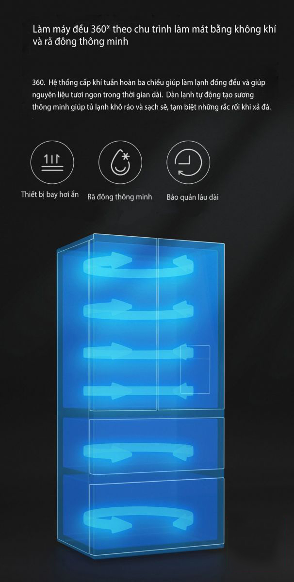 Tủ lạnh Xiaomi 445L còn được trang bị hệ thống cung cấp không khí tuần hoàn kép 360 độ từ đó giúp bảo vệ thức ăn tươi mát đều và lâu hơn tủ lạnh thông thường, tránh bị thổi trực tiếp gió vào thức ăn, gây mất nước cho thức ăn để bảo quản hương vị ban đầu cho thức ăn được lâu hơn.