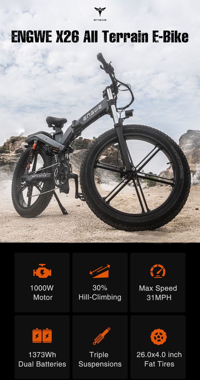 ENGWE X26 - một con quái vật hoạt động trên mọi địa hình với sức mạnh 1000 W, hệ thống pin kép và hệ thống treo ba lần.Lốp xe béo giúp dễ dàng đi qua ổ gà, tuyết hoặc cát. Tốc độ tối đa 50 Km/H, bạn có thể gấp gọn gàng X26 vào thùng xe của mình để có những chuyến du ngoạn tuyệt với hơn.
