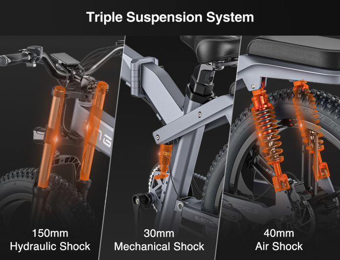 Chuyến đi êm ái nhất mà bạn từng trải nghiệm, Hệ thống giảm xóc thủy lực của Engwe X26 mang đến cho bạn trải nghiệm bay bổng. Khi vượt qua chướng ngại vật hoặc điều kiện đường xấu ở tốc độ cao, hệ thống giảm xóc thủy lực duy nhất đảm bảo cho bạn trải nghiệm lái xe thoải mái hơn và những va chạm mà bạn cảm thấy sẽ giảm đáng kể. Bạn có thể vượt qua đường ray xe lửa, núi, bãi cỏ, đường rải sỏi, và tất nhiên, đường đô thị một cách dễ dàng.