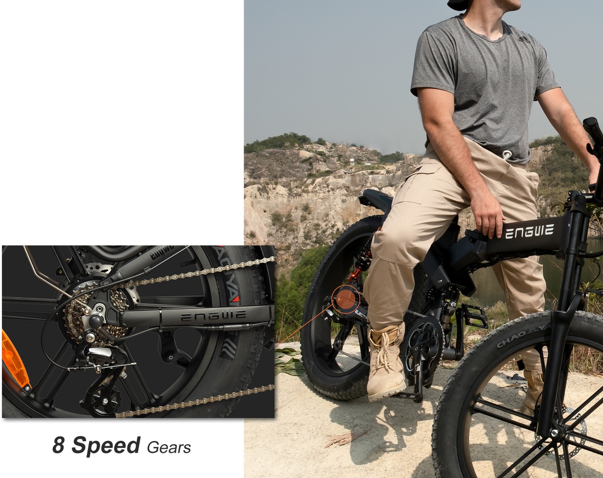 Với Shimano 8 cấp số, Engwe X26 có thể sử dụng ít sức hơn khi lên dốc và tránh nguy hiểm khi lái xe quá nhanh khi xuống dốc. Engwe X26 có thể linh hoạt điều chỉnh tốc độ của xe hoặc đáp ứng các điều kiện đường khác nhau. Và nó cũng có thể linh hoạt, nhanh chóng và hiệu quả, làm cho nó trở thành một sự lựa chọn tốt cho các địa hình khác nhau.