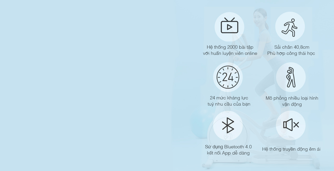 KHông biết bắt đầu từ đâu ? đó là tâm lý chung của đa số khách hàng mới, để gải quyết điếu đó chúng tôi có App với kho ứng dụng hàng ngàn video với hàng trăm huấn luyện viên nam nũ tuỳ bạn lựa chọn để tập cùng, mỗi khoá học sẽ đem đến cho bạn 1 sự cải thiện đáng kể. Để hiệu qủa được tối ưu chúng tôi cố gắng trau truốt thiết kế và cấu tạo máy vừa đẹp vừa hiệu năng cao nhất.