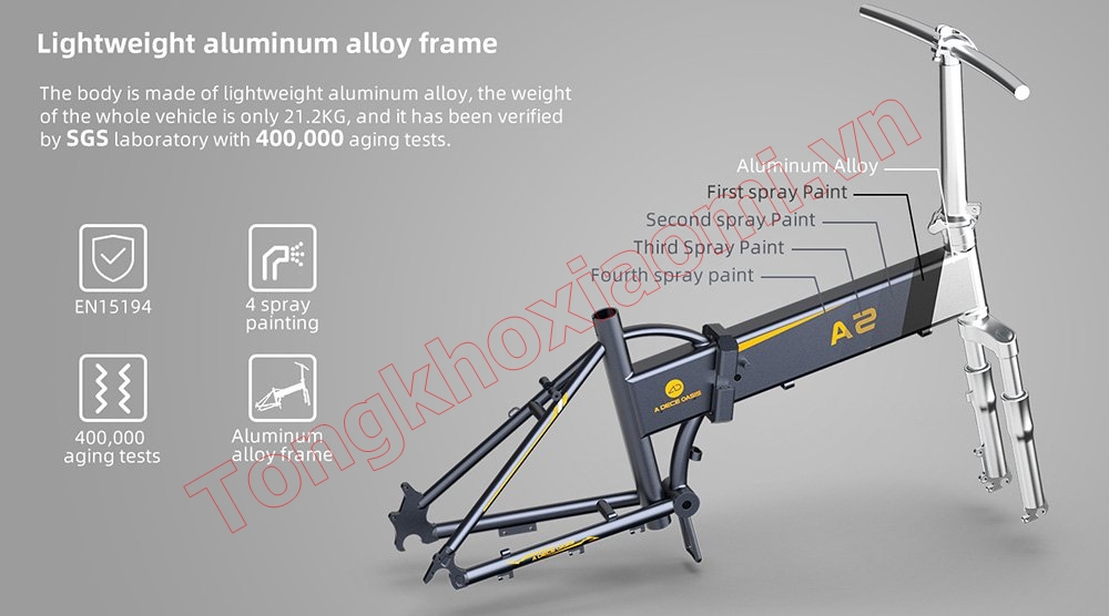 Khung được làm bằng hợp kim nhôm nhẹ , và trọng lượng của toàn bộ chiếc xe đạp chỉ 21,2KG , và nó đã được kiểm chứng bởi phòng thí nghiệm SGS 400.000 lần về độ tuổi